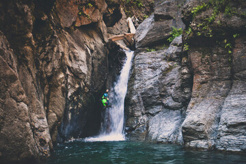Man canyoneering in Deneau Creek, Hope, British Columbia, Canada
