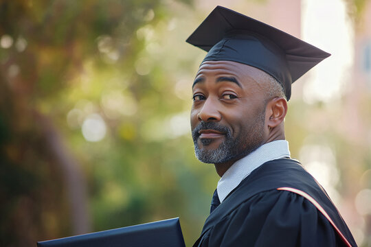 A proud black mid-aged male graduate in a cap and gown smiles with confidence, holding a diploma in a scenic outdoor setting under soft natural light