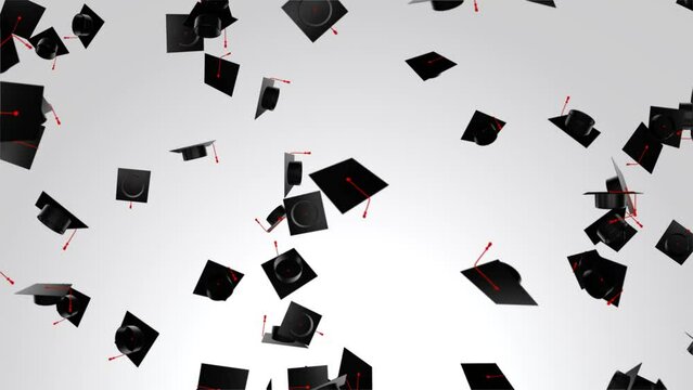 3D 4K animation of a graduation hats in the air sky background. University completion and diploma awarded ceremony. social distancing. Students. Leaving school, college, certificate.