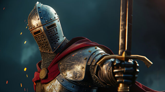 A valiant knight in full armor holding a sword, ready for battle, with a red cape and helmet.
