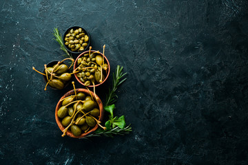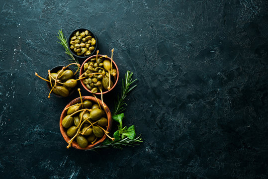 Capers. Marinated capers in a bowl on a black stone background. Top view. Free space for your text.