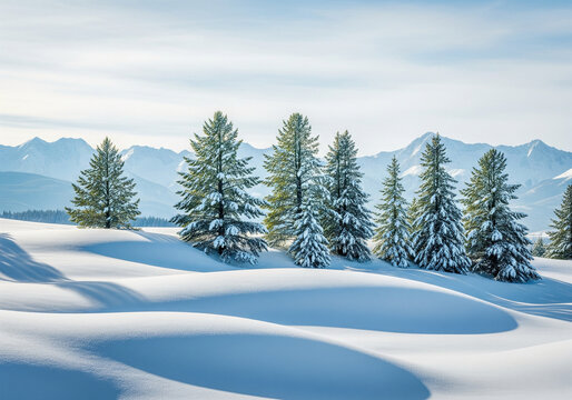 Evergreen trees covered in snow stand on rolling snowdrifts before distant snow capped mountains isolate