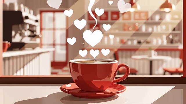 Red Cup of Coffee With Hearts Steam Rising in Cafe Background