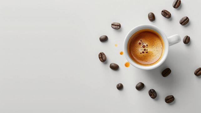An espresso machine in action, brewing a cup of cappuccino with froth, accompanied by coffee beans. Perfect for cafe promotions and coffee lovers.