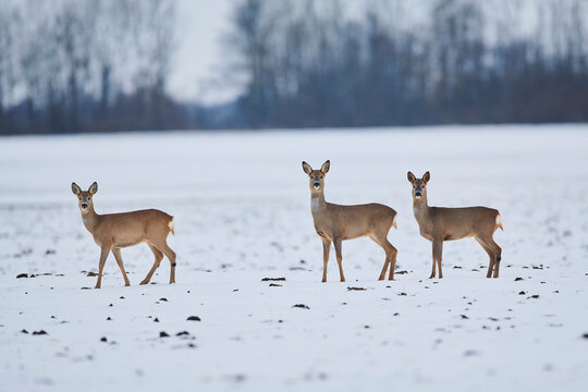 Three Roe deer (Capreolus capreolus) standing on a snowy field; Wiesent, Bavaria, Germany