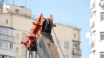 Tower Crane Hoist Rope against the blue sky and high building. Hawser of crane winch. Hoist Rope of Building crane. Crane lifting cables. Builder equipment on a construction site. Close Up.