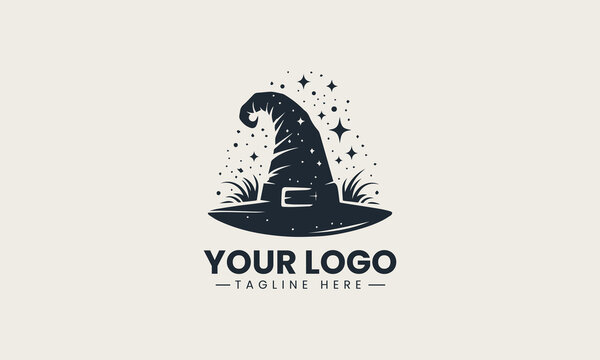 Black vector illustration of pointed witch hat with magical spark elements for logo use