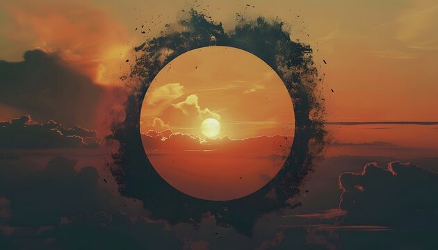 Minimalist dystopian company logo of a circle with several lines in the centre, sunset background