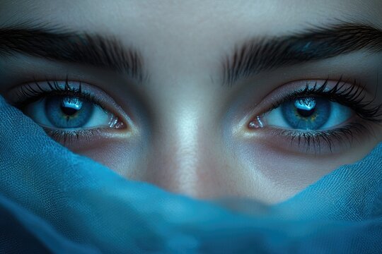 Mysterious blue eyes peering from behind a translucent teal veil, a captivating gaze.