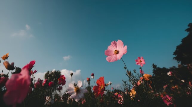 Vibrant flower blossoms in a sunny field nature photography bright blue sky serene environment upward perspective