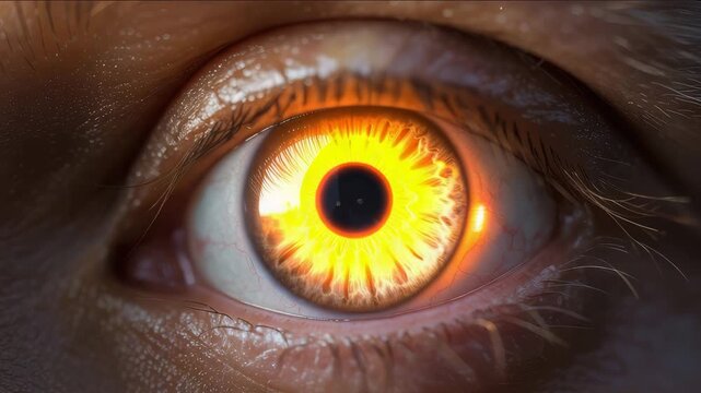 Intense fiery eye reflecting desert sunset, captivating close-up for sci-fi, fantasy and mystical themes