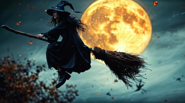 Halloween. A young witch flying on a broomstick through a mystical forest during autumn, with vibrant orange leaves falling around her. Perfect for themes of fantasy, Halloween, magic, and adventure.