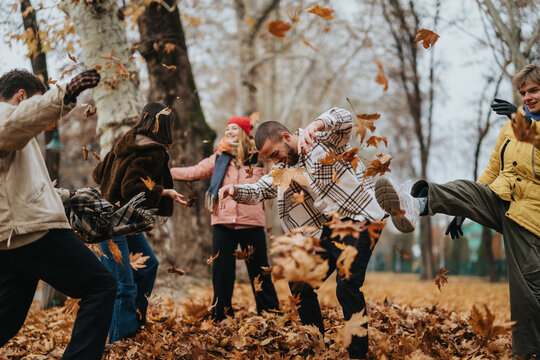 A joyful group of friends playfully throwing autumn leaves in a park surrounded by trees, capturing the fun and warmth of the season.
