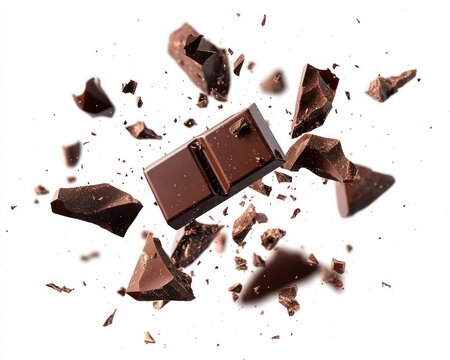 Close-up of broken dark chocolate pieces scattered on a white background capturing the moment of disintegration with fine crumbs and fragments floating mid-air
