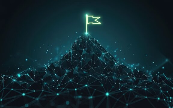 A man stands atop a mountain, proudly holding a flag. The image captures a moment of triumph and leadership.