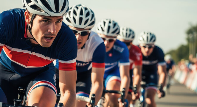 Cyclists race in a competitive road cycling race, athletes speeding forward with intense focus. Competitive road cycling action captures determination and teamwork among cyclists during race.