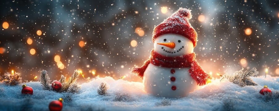 Charming snowman in a winter wonderland, adorned with a bright scarf, capturing the festive spirit of the holiday season.