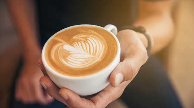 Late art a cup of coffee on barista hands. young hipster love coffee