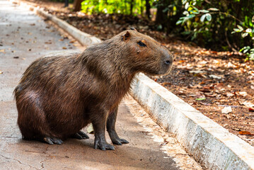 Portrait of a Capybara mother with group of pups standing on a river bank