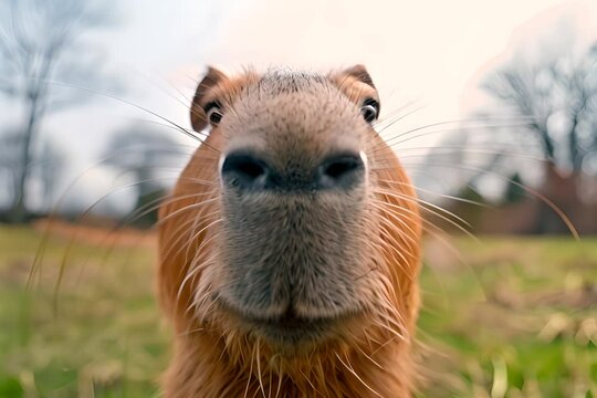 Capybara Close up Portrait, Fun Animal Looking into Camera, Capybara Nose, Wide Angle Lens, Funny and Adorable Animal, Oversized Cute Nose, Generative AI Illustration