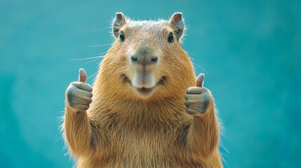 Portrait of a happy capybara giving thumbs up in front of a blue background celebrating success and joy in a playful moment captured in an isolated space