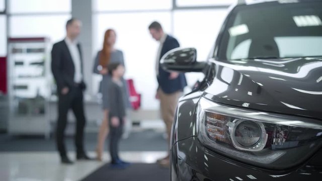 Close-up of car headlamp with blurred people talking at the background. Caucasian dealer consulting family in car dealership. Auto industry, trading, purchasing.