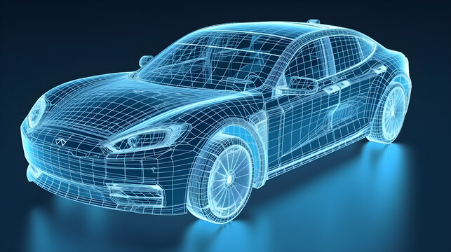 Wireframe rendering of electric car on light blue background. Generative AI