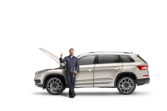 Auto mechanic leaning on a SUV with an open hood and gesturing thumbs up