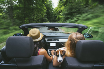 Two female friends and a Jack Russell driving a cabriolet car