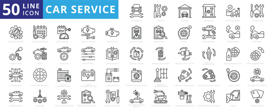 Car service icon set with garage, workshop, auto mechanic, technician, station, lubrication, maintenance and automotive.