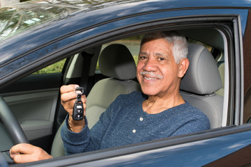 Happy young hispanic couple holding car keys in front of new vehicle in showroom