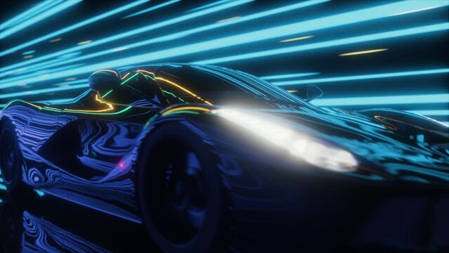 3D Car Model Driving on a Bright Road in Neon Colorful Blue Purple Tunnel at a High speed. Modern Dark Supercar Driving Fast on Highway. Hyperspeed. Racing. Lights Reflecting. 3D Animation. 4K