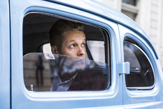 Vintage car sales flyer featuring joyful couple in classic convertible