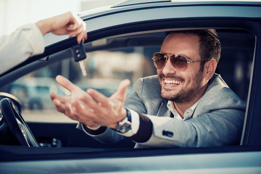 Hand of business man gives the car key, Close-up image a man buys a car and receives keys from the seller.