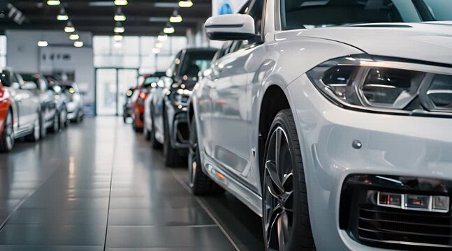 Cars For Sale, Automotive Industry, Cars Dealership Parking Lot. Rows of Brand New Vehicles Awaiting New Owners, on the epoxy floor in new car service