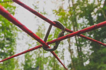 climbing carabiner holds between some ropes red