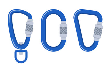 Carabiner clasp. Metal colored carabine for climbing rope link, metal snap hook for bag, safety or protecting haberdashery gear accessory set vector illustration isolated on white background