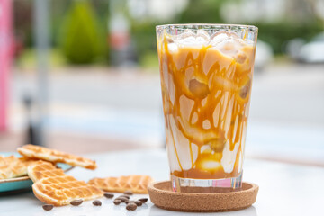 Iced caramel latte coffee in a tall glass with caramel syrup