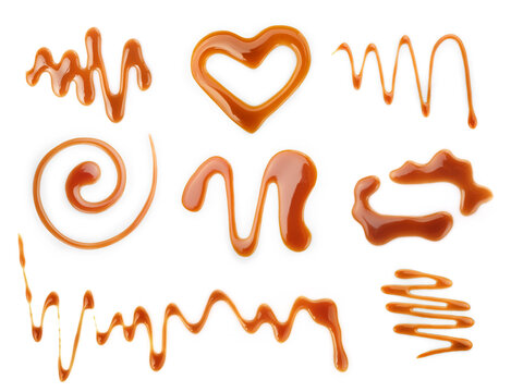Set of sweet caramel topping isolated on white background. Top view.