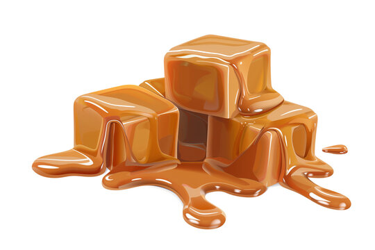 Salted caramel candy cubes drizzled with caramel sauce and sprinkled with sea salt on a clean white background viewed from above