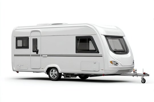 Modern White Travel Caravan with Sleek Design and Large Windows in Studio Setting