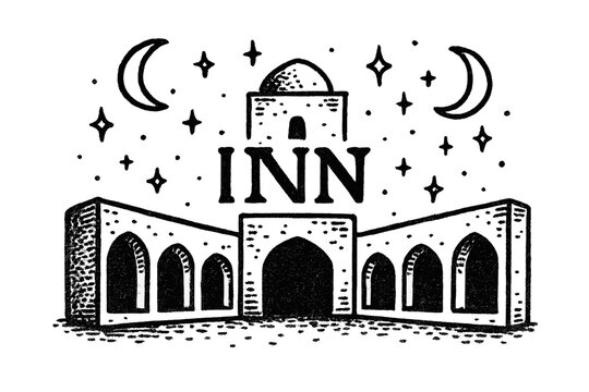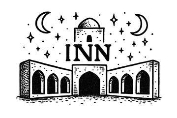Caravanserai Sketch Design. Hand-drawn caravanserai with moons, arches, and sparkles, center word “Inn” in black and white