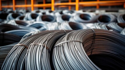 High carbon wire rod stacks for heavy industry use at construction sites and building projects showcasing metal steel wire rolls.