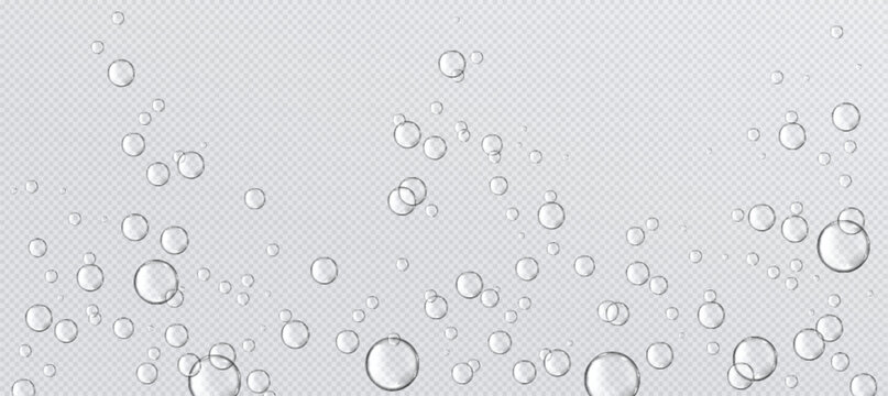Fizzy water bubbles floating on transparent background. Multiple sized spherical shapes for effervescent pattern. Realistic 3d vector natural carbonated liquid effect with scattered droplets.