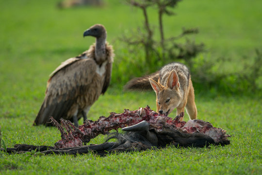 Vulture watches black-backed jackal eating wildebeest carcase