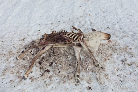 Reindeer carcase at Aittakuru in lying in snow in spring, Pelkosenniemi, Lapland, Finland.