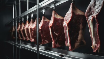 Beef Cuts in Cold Storage, Cattle Processing, Butcher Factory, Meat Industry, Food Chain Production