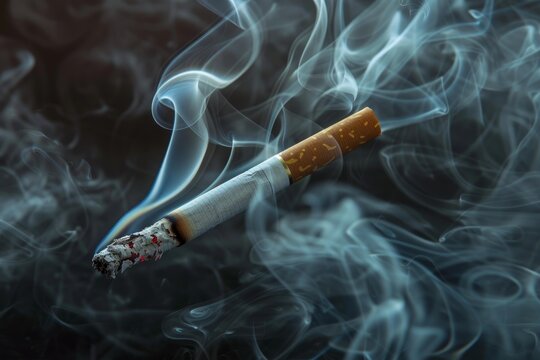 Lit cigarette is smoldering, emitting smoke against a dark backdrop, symbolizing smoking habits