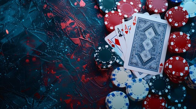 Casino gaming flat lay with cards and chips on a table, highlighting the excitement of gambling. Ideal for illustrating casino and entertainment visuals