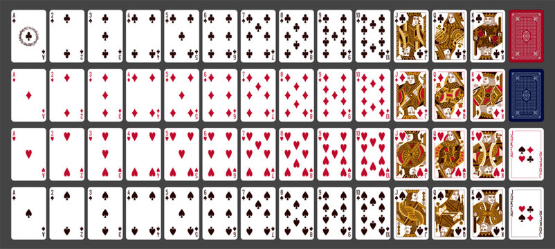 Gold and white playing printable vector cards for gambling (poker, bridge), deck of 52 cards. Silhouette a portrait of the King, Queen, Jack and Joker and spades, hearts, diamonds, clubs  suits.